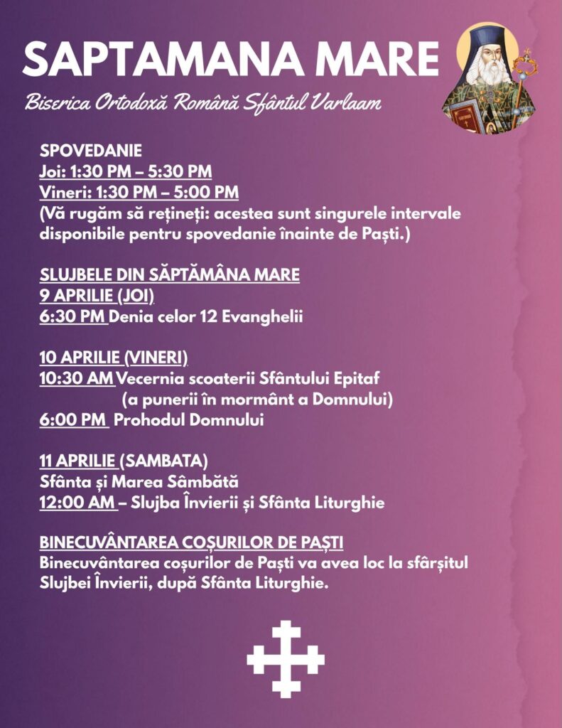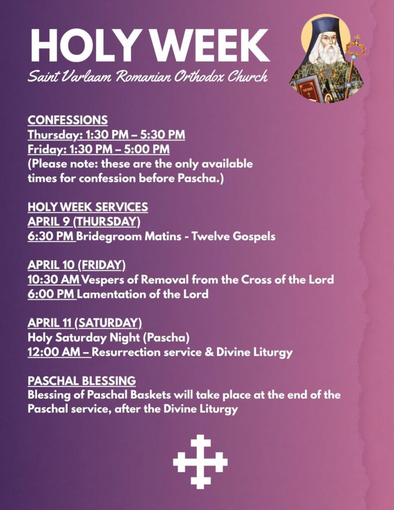 Posted on April 9, 2026 Posted By: Father Lucian Categories: Weekly Buletin Dear Faithful, Please see the poster below for the Holy Week and Pascha schedule. We look forward to praying together with you! Holy Week